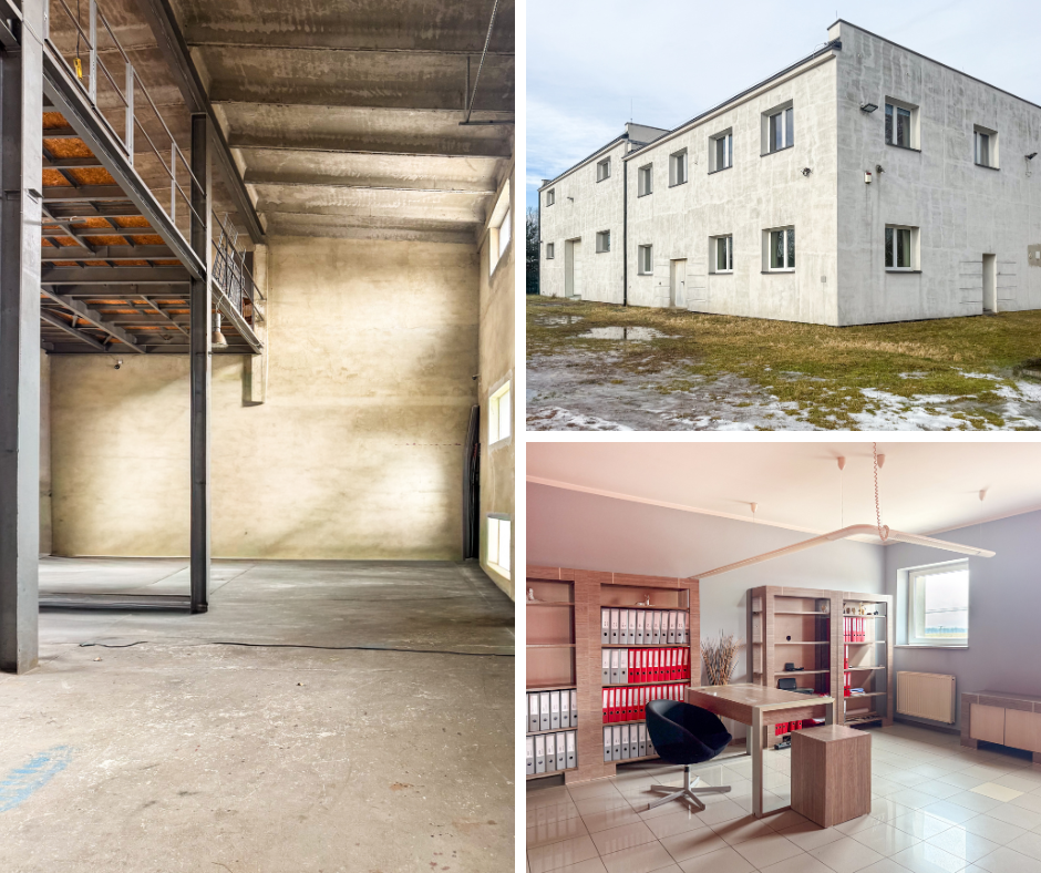 Na terenie nieruchomości znajduje się budynek usługowy z halą magazynową, idealny do prowadzenia różnorodnej działalności gospodarczej.