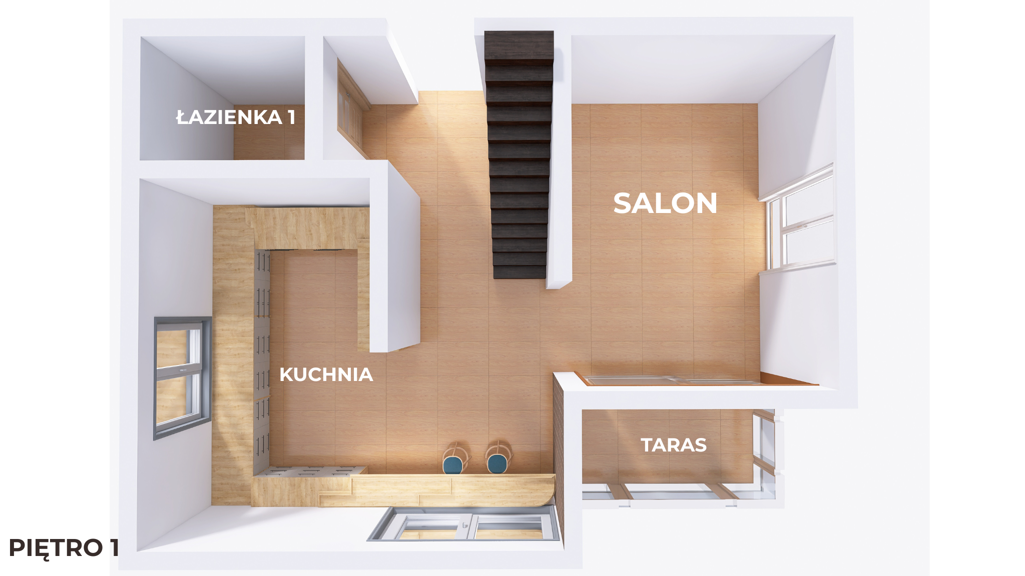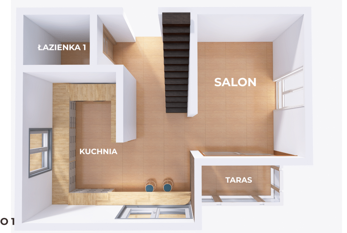 Wnętrze urządzone zostało w klimacie industrial + boho, z naciskiem na naturalne światło i funkcjonalność.