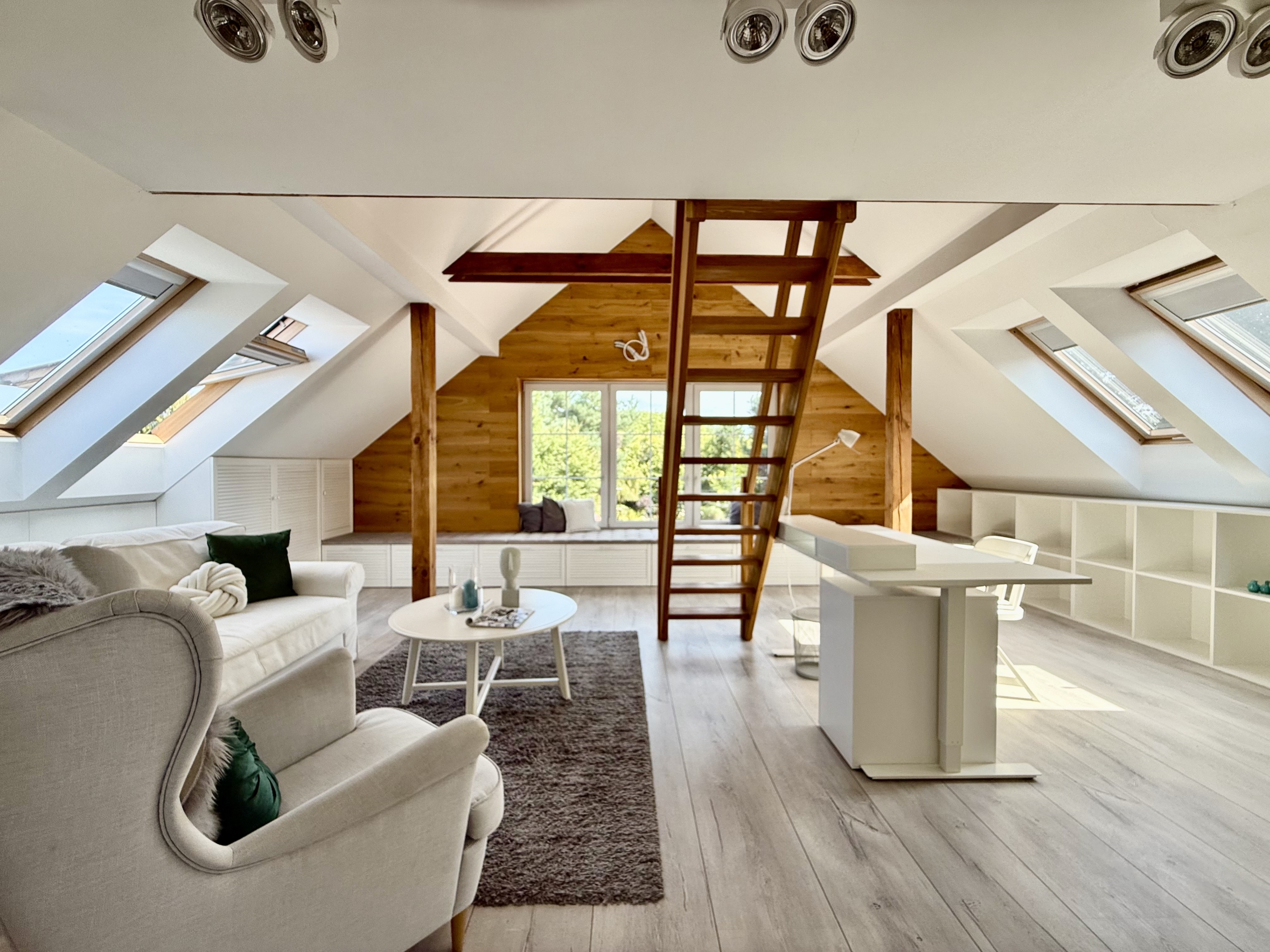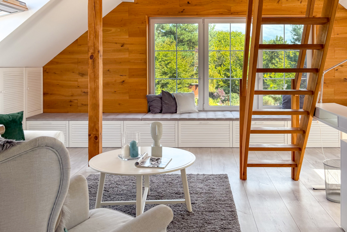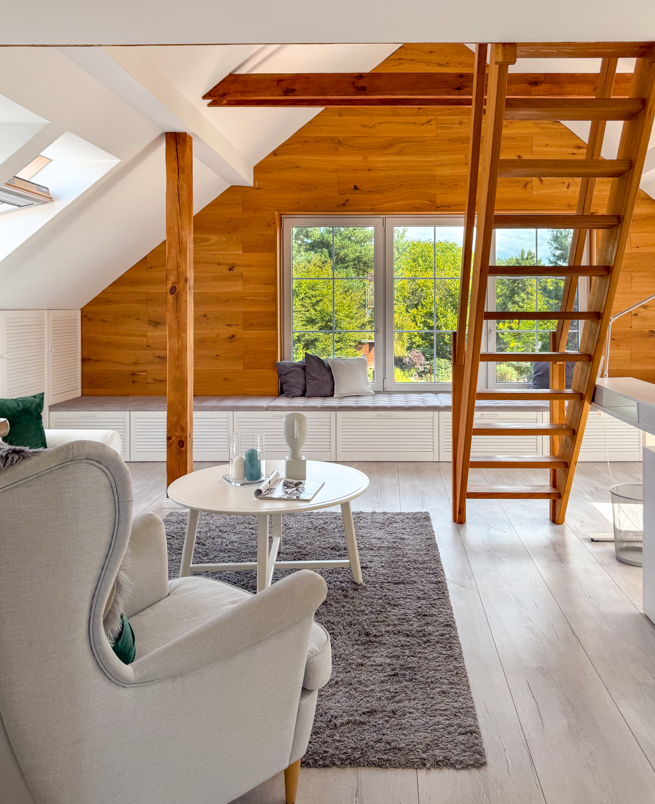 - Wyjątkowy pokój na poddaszu z antresolą, dużymi oknami dachowymi i zabudowanymi szafami – idealny jako pokój dziecięcy, młodzieżowy, biblioteka, domowe biuro lub pracownia. Wygodne siedzisko przy oknie z widokiem na ogród tworzy idealne miejsce do relaksu z książką i filiżanką herbaty