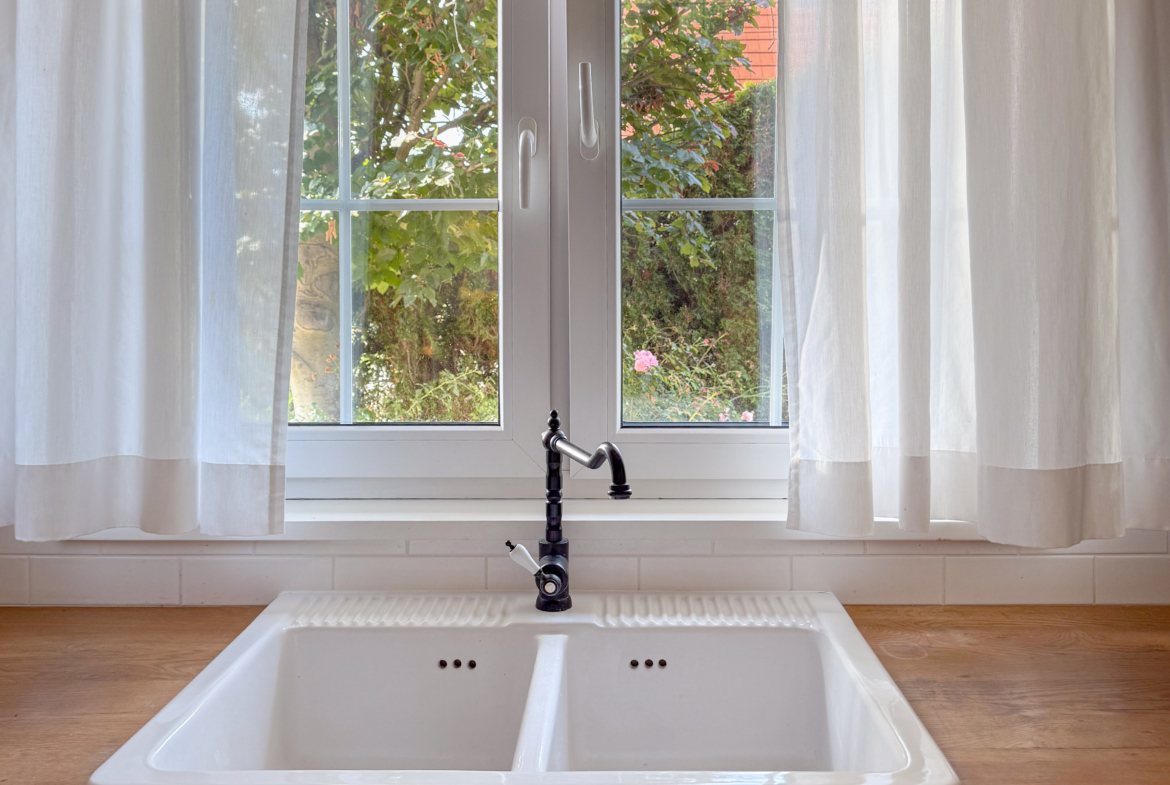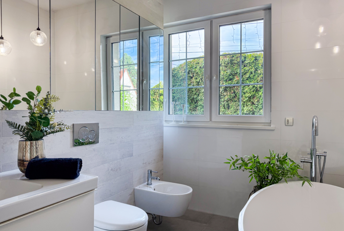 - Panoramiczne okna od podłogi do sufitu z widokiem na ogród – naturalne światło i kontakt z naturą