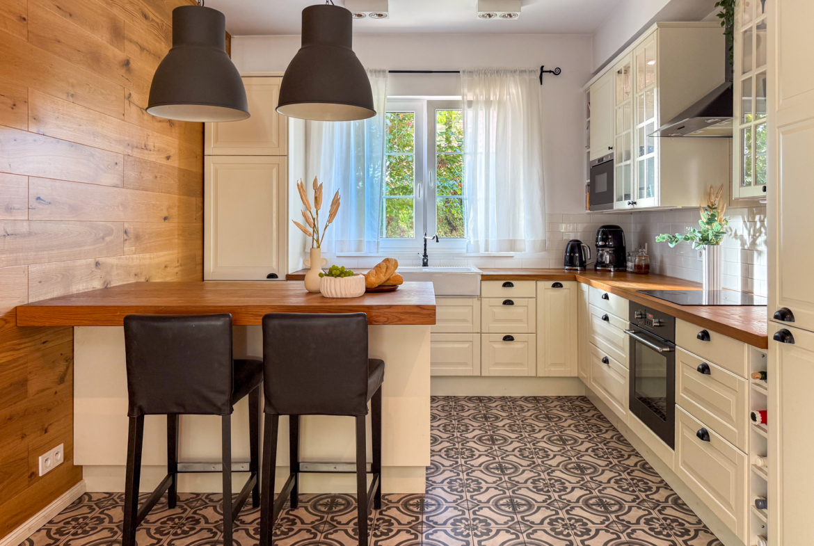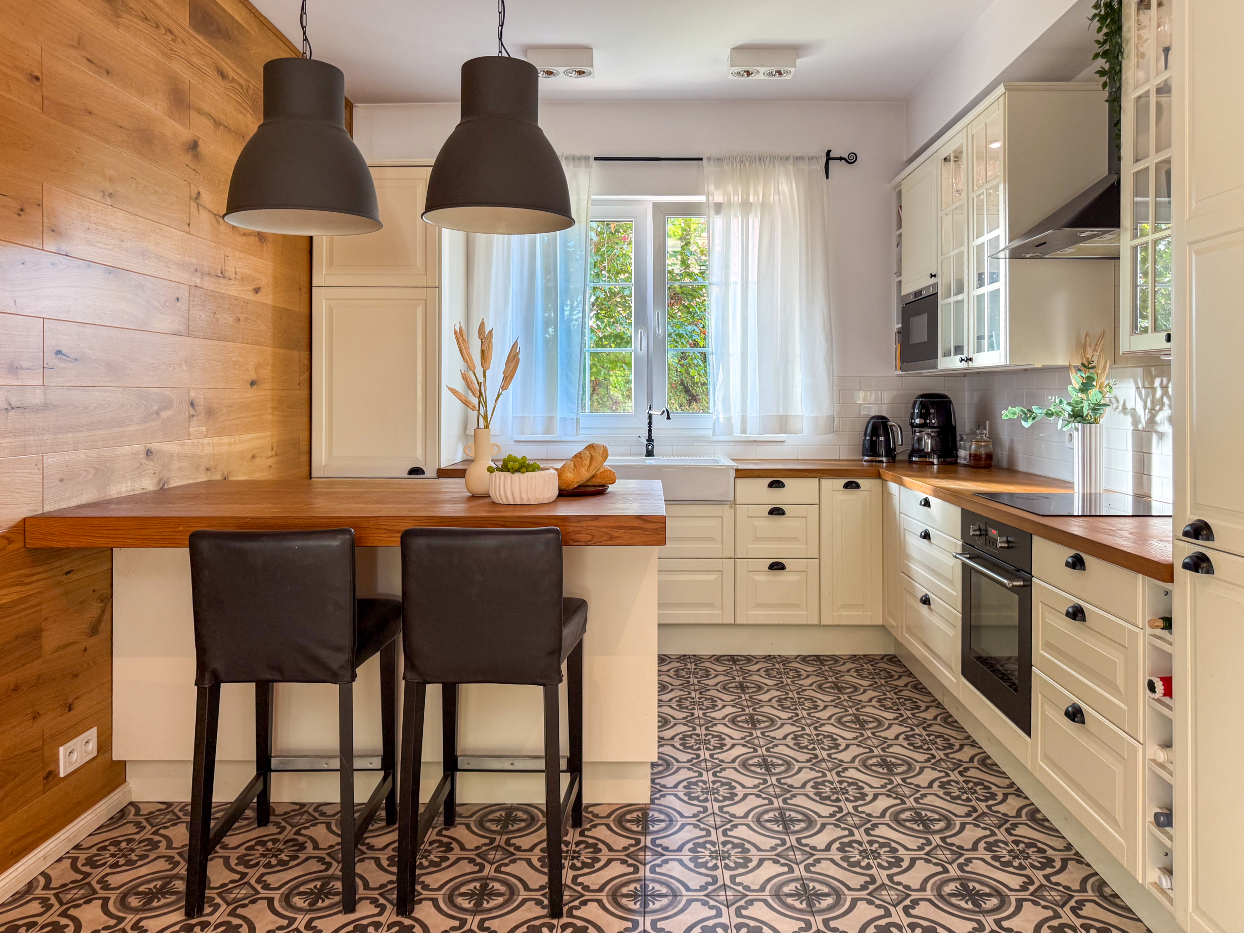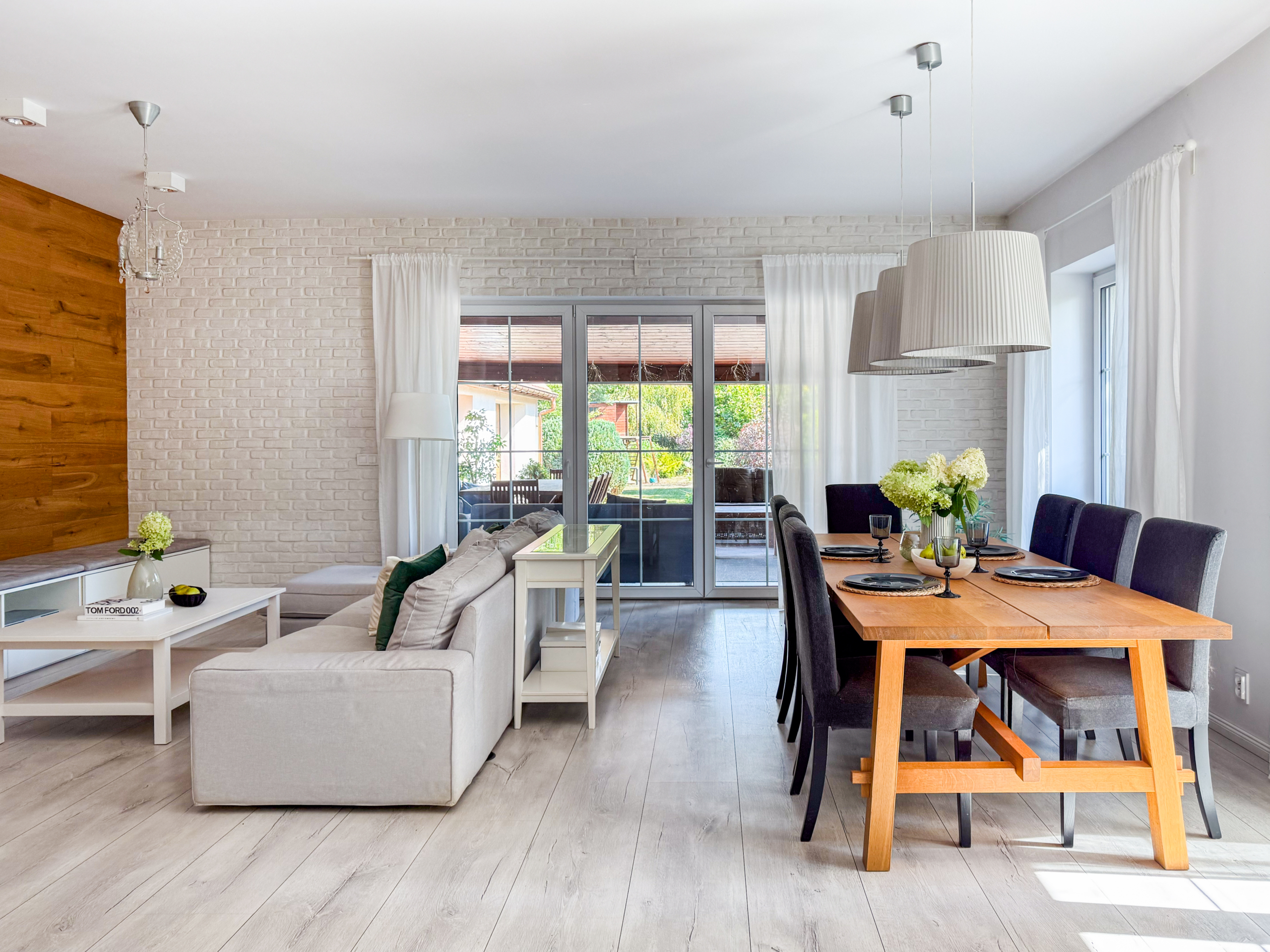 Wnętrza domu zostały zaprojektowane w złamanej bieli, naturalnym drewnie i ciepłych szarościach, tworząc harmonijną i elegancką przestrzeń. Charakter willi podkreślają piękne drewniane belki, które dodają przytulności i wyjątkowego klimatu.