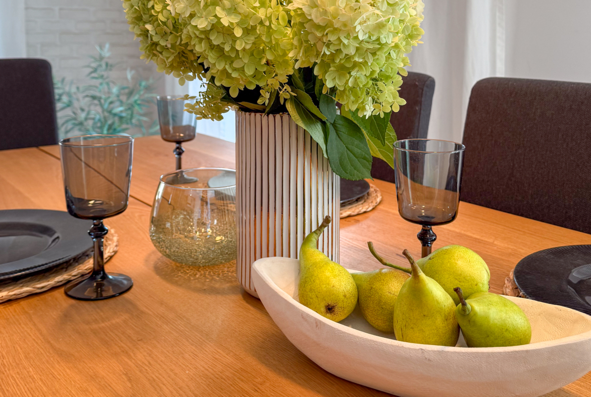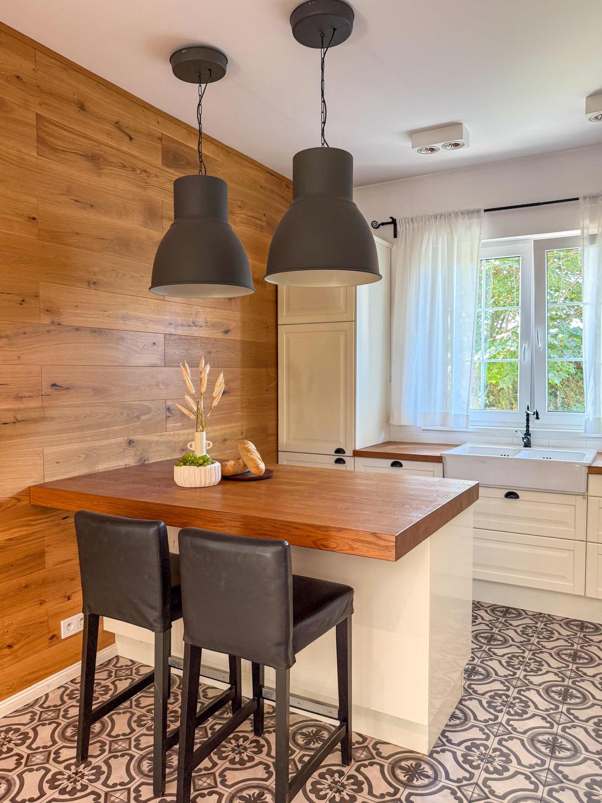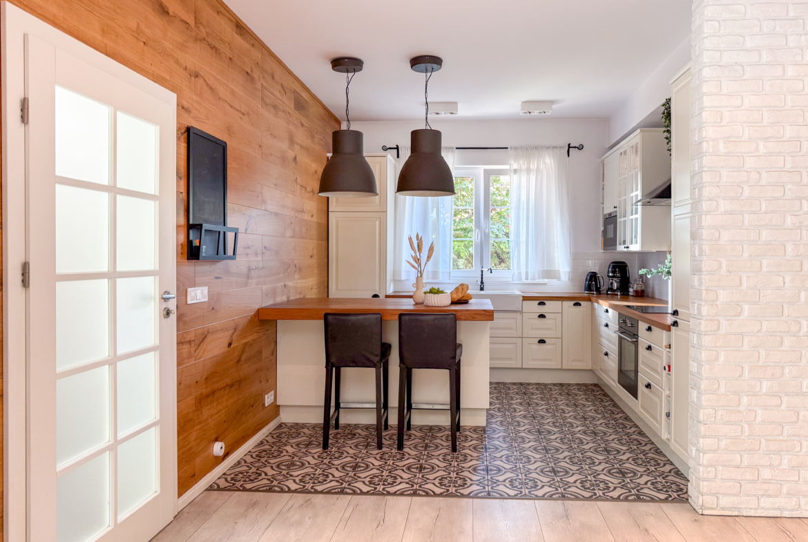 Wnętrza domu zostały zaprojektowane w złamanej bieli, naturalnym drewnie i ciepłych szarościach, tworząc harmonijną i elegancką przestrzeń. Charakter willi podkreślają piękne drewniane belki, które dodają przytulności i wyjątkowego klimatu.