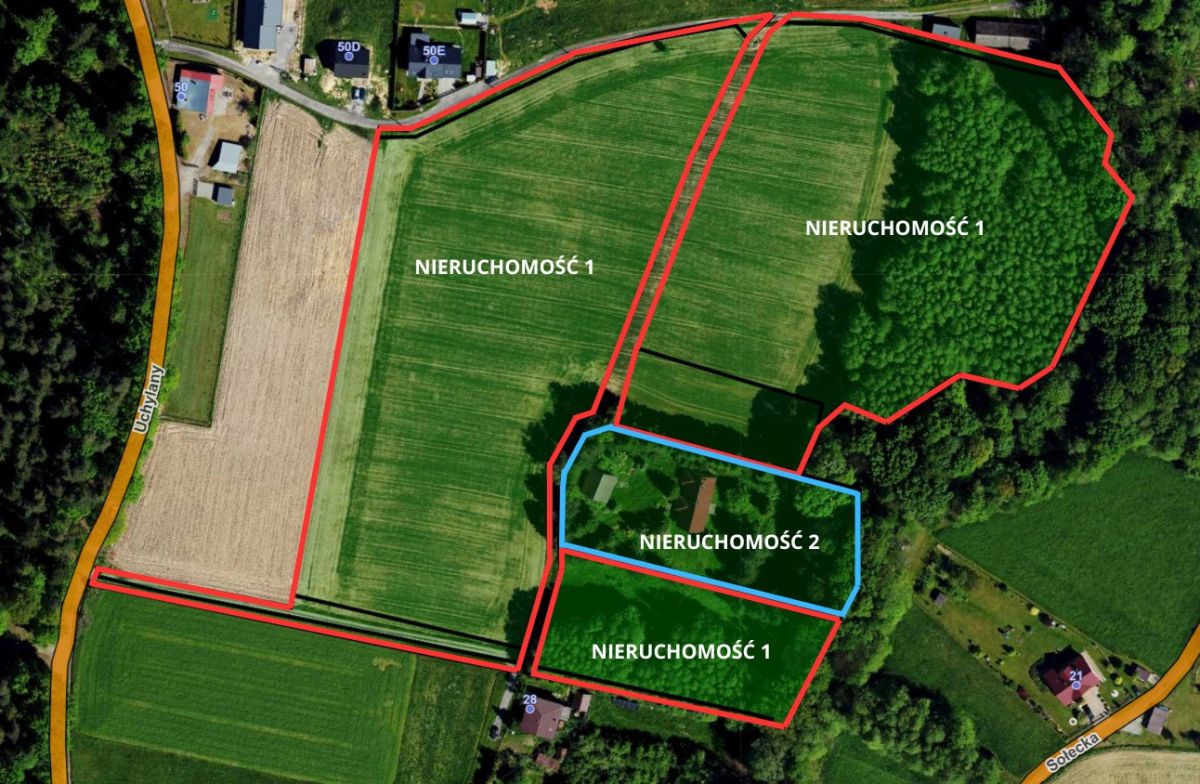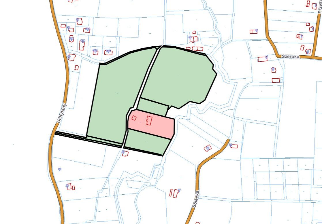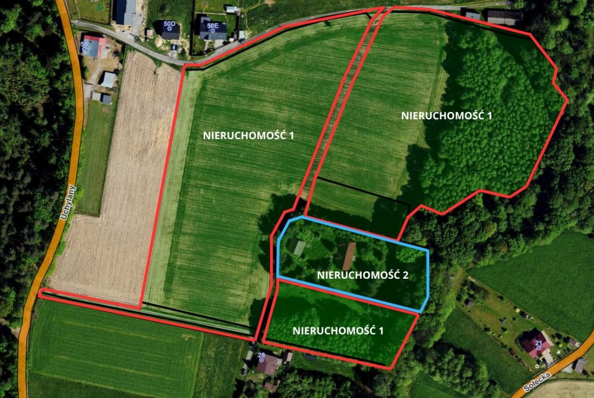 Dojazd do nieruchomości z ul. Uchylany prowadzi przez teren sąsiadującego z nieruchomością gospodarstwa rolnego o pow. 4,5995 ha – z tego względu preferowana jest sprzedaż łączna przedmiotowej nieruchomości, oznaczonej na mapie jako nieruchomość nr 2, z nieruchomością rolną oznaczoną na mapie jako nieruchomość nr 1: