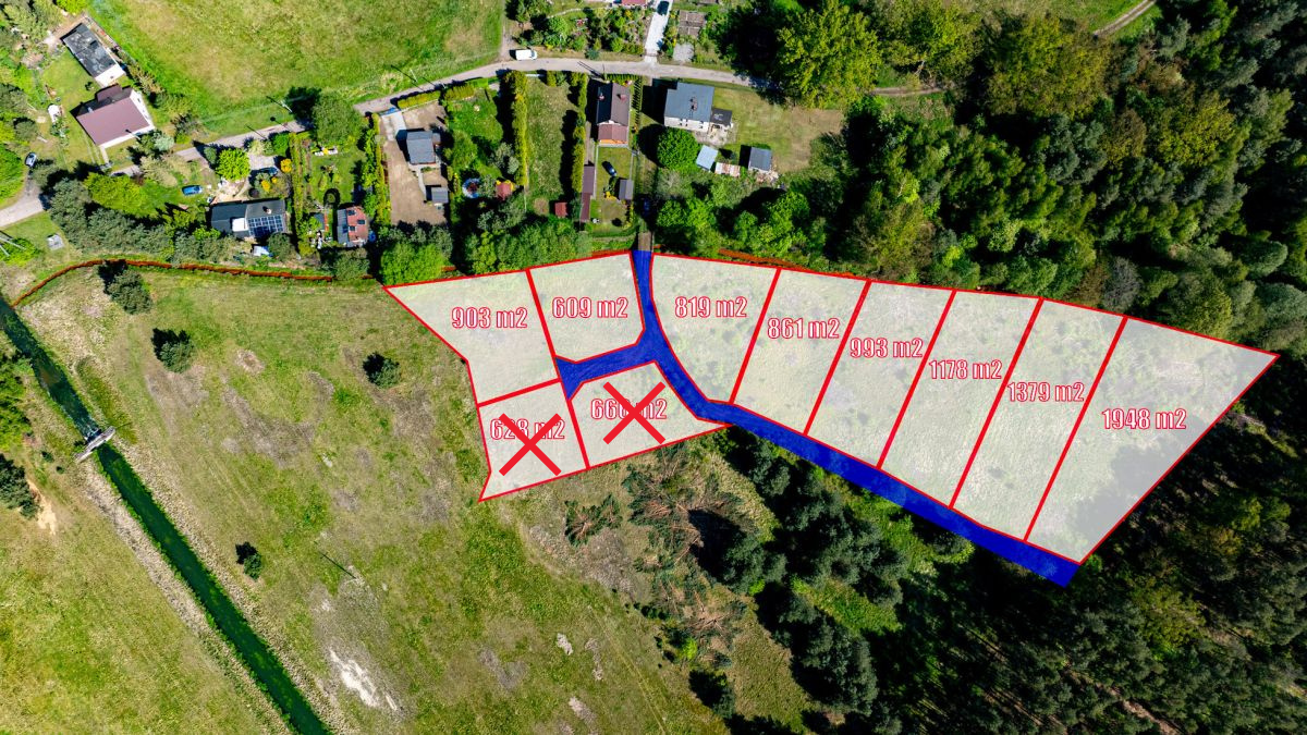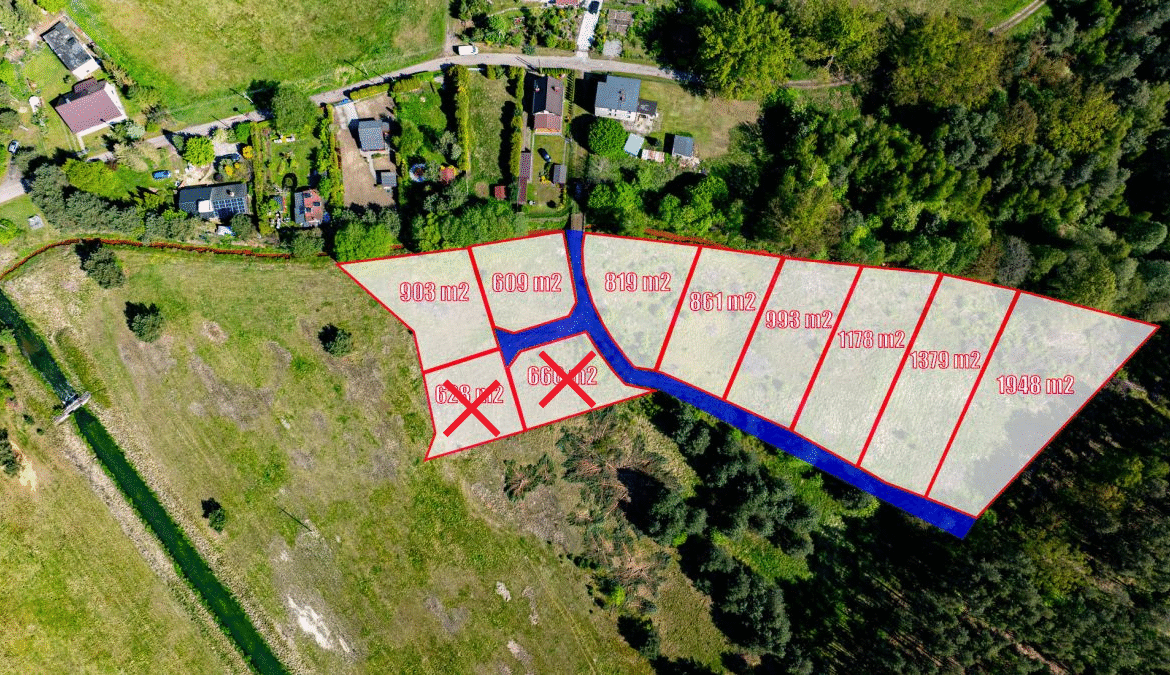 • Dogodne kształty i powierzchnie – działki mają formę zbliżoną do prostokąta i różnią się wielkością – od 609 m² do 1948 m².