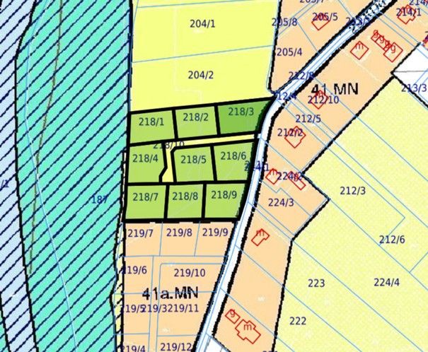 Działki 218/1, 218/4 i 218/7 znajdują się w niewielkiej części na terenie oznaczonym 1.ZR – zieleń nieurządzona (bez możliwości zabudowy). Teren ten może być jednak wykorzystywany jako przestrzeń zielona, ścieżka, ogród lub miejsce wypoczynku.