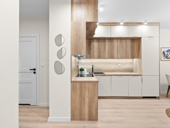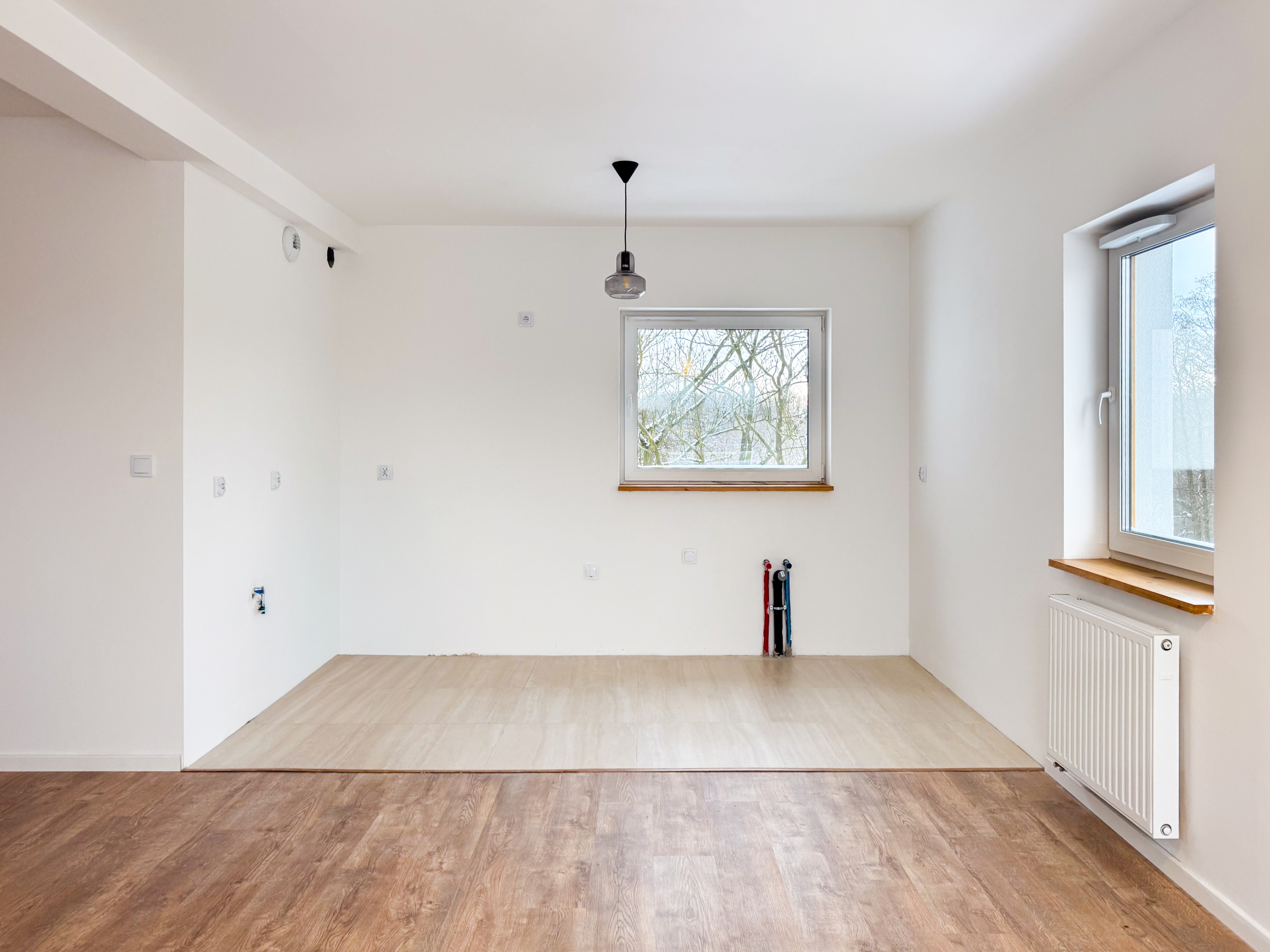 W salonie zostało przygotowane miejsce pod aneks kuchenny – z doprowadzonymi instalacjami wodno-kanalizacyjnymi oraz elektrycznymi. Rozwiązanie to pozwala na swobodną aranżacj